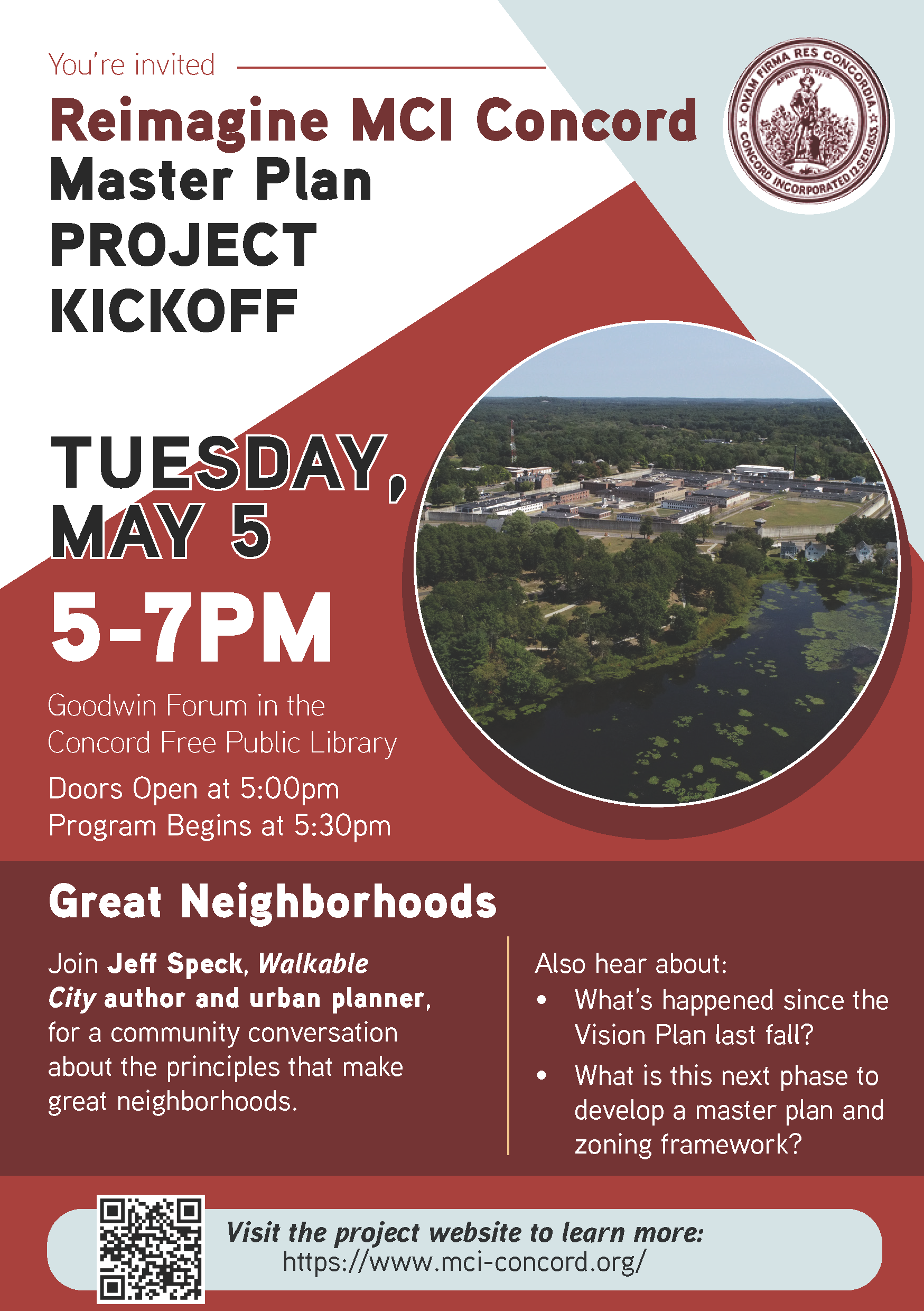 Please join us on Tuesday, May 5 for a project kickoff event featuring a “Great Neighborhoods” presentation and community conversation led by Walkable City author and urban planner Jeff Speck. More information will also be shared about what’s happened since the Vision Plan process and what to expect during this next phase. The event will be held at the Goodwin Forum in the Concord Free Public Library. Doors open at 5:00 pm and the program will begin at 5:30 pm. We hope to see you there!